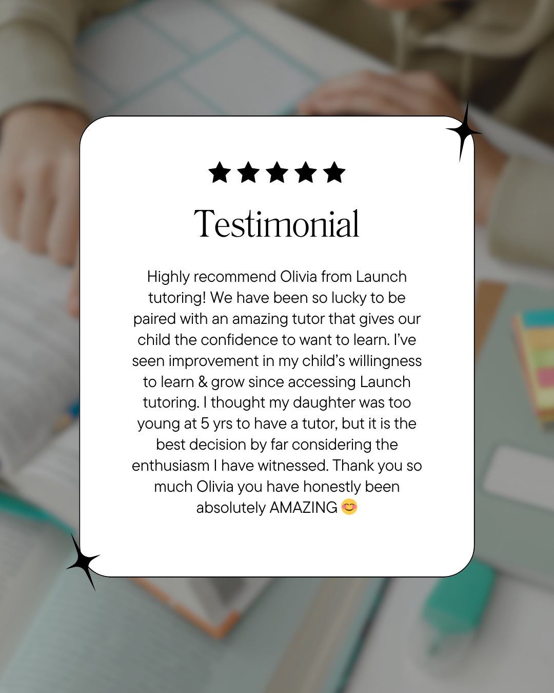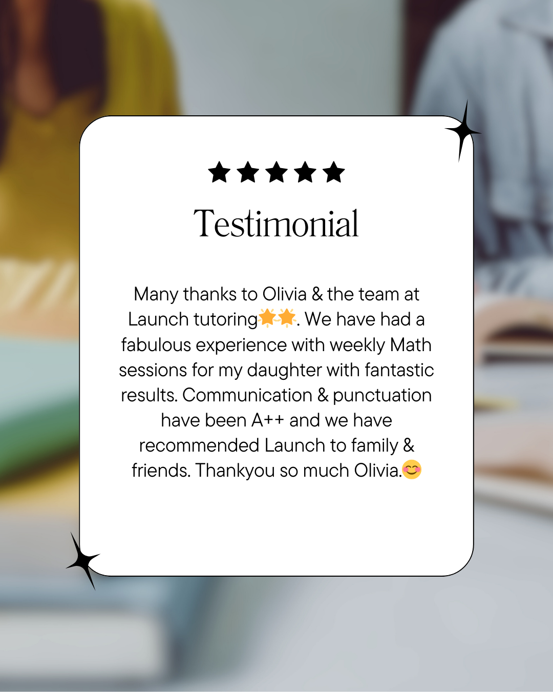“Many thanks to Olivia & the team at Launch tutoring. We have had a fabulous experience with weekly Math sessions for my daughter with fantastic results. Communication & punctuation have been A++ and we have recommended Launch to family & friends. Thank you so much.”